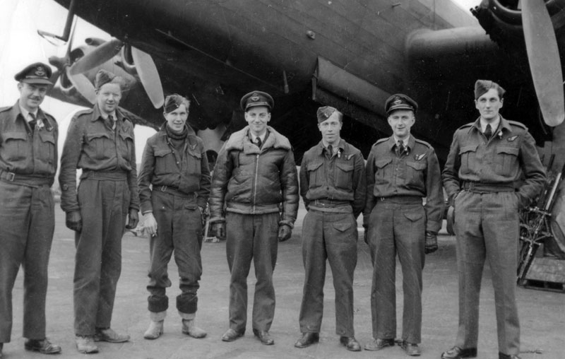 This photograph is believed to show the crew of Halifax PN228. Using their photos shown below I suggest the crew list is (left to right) Atkinson, Miller, Linstead, Garrett, McLeod, Parker, Jerome. I thank Kenneth Parker's nephew Mr Doug Parker for kindly supplying this photograph.