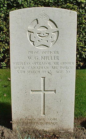 William Miller was born on 15th May 1924 at Lloydminster, Saskatchewan, Canada and was the son of Harold Gordon and Mary Ann (nee McLellan) Miller. He was fresh out of school when he enlisted for RCAF service in Saskatoon on 20th August 1942 and after basic training was awarded his Air Gunners' flying badge on 4th October 1943. He appears to have already done the wireless operator part to his training before October 1943 as he was posted to the UK on 22nd October 1943. On arrival in the UK he trained at 5 AOS, 82 OTU and 1664 HCU before posting to 426 Squadron on 17th September 1944. He appears to have received a backdated commission after his death, back dated to 4th March 1945.