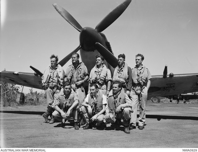 Eric Bocock's family were from the Bury St.Edmunds area of Suffolk. After enlisting for RAF service he trained at 58 O.T.U. before receiving a commission in January 1941 and being posted to 72 Squadron soon after. He later served with 602 Squadron, being awarded the DFC for service with them, Gazetted on 10th April 1942. The citation stated "Since July, 1941, this officer has participated in many operational sorties. Throughout, he has displayed courage, initiative and great energy. He has destroyed at least three enemy aircraft, two of which he shot down on one sortie." He later served in 234 Squadron before joining 54 Squadron then 549 Squadron in No.1 Fighter Wing flying Spitfires in Australia, the latter a squadron he commanded. While with 549 Squadron on 27th November 1944 he took part in the longest Spitfire operational sortie when he escorted USAAF B25's to Timor in the Dutch East Indies, he flew Spitfire A58-341 on this flight. By the end of July 1945 it was the end of what became known as the "Churchill Wing" for the Spitfires and all were posted back to the UK. In 1946 he was posted to Leconfield and became the Central Gunnery School's chief ground instructor. He is pictured in the centre of the back row in this 549 Squadron group photograph (shown below).