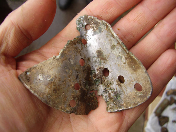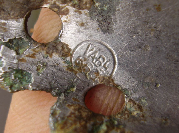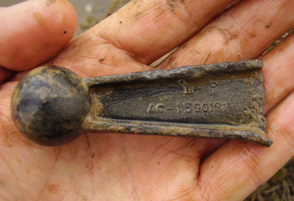 The two photographs above show a piece unique to the Wellington / Warwick design and is a geodetic joining plate, the inspection stamp "VABL" shows the aircraft to have been made in the Blackpool factory thus confirming that this was a Wellington crash site amongst the many Halifax's which came down in within a few fields. The photograph below shows another part found and is currently unidentified though is clearly some form of ball joint. I visited the crash site in September 2008 with Ken Reast, Albert Pritchard and Eric Barton. I would like to thank Ken for arranging this visit and to the landowner for his help.