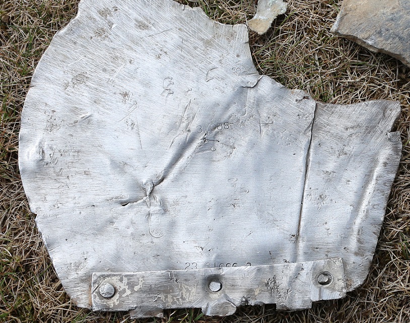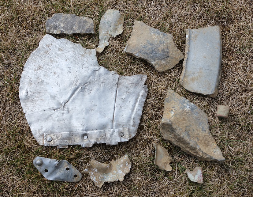 Historians Ken Reast, Eric Barton and Albert Pritchard located small remains at the crash site with permission from the landowner in 2003 to confirm the location. These photographs show small fragments retained by Eric, one of which shows various Harvard part numbers and markings after a liberal use of his hammer to flatten it.