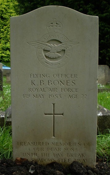 Kenneth Bones was born on 17th October 1930 in Essex but his family appear to have moved to the Leicester area when he was a child. He attended Wyggeston Grammar School where he captained the school rugby team and was a member of the ATC in Leicester as a boy. He was granted a commission in the RAF after training at Cranwell on 12th December 1951. While undertaking training at the Central Flying School in 1952 he was awarded the Brabyn Trophy for the best aerobatic routine flown. He was a qualified flying instructor at the time of his death.