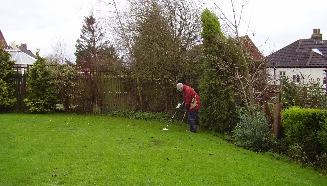 The now late Eric Barton about to run his metal detector over and not his spade through a beautifully manicured lawn.