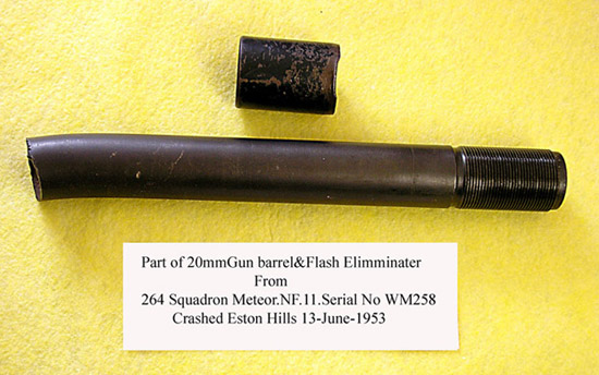 On 13th June 1953 there was to have been an exercise involving Meteors from 264 Squadron and aircraft from other squadrons over general area of the River Tees area. The weather however put paid to the immediate plans and the exercise was cancelled. The Meteors from 264 Squadron were then ordered to fly at 2000 feet and exercise the defences at Thornaby and Oulston airfields. The pilot of Meteor WM258 was the Squadron Commander for 264 Squadron, he ordered all other aircraft to descend through the cloud at their descretion and to make dummy attacks on the airfields. The Commander's aircraft was to have made an attack on Thornaby airfield but would be the one to crash, at about 18.45hrs it flew into high ground on the Eston Hills, to the south of Eston Nab, sadly killing both crew. The wreckage was spread over a wide area.