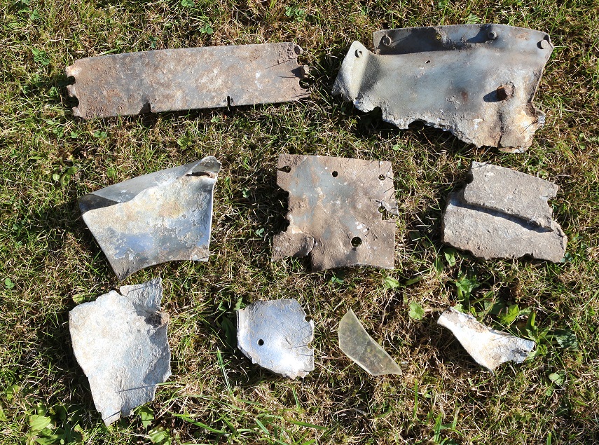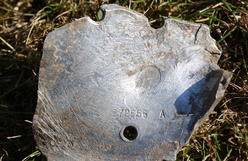 Eric Barton, Albert Pritchard and Ken Reast attended a search of the woodland to confirm the crash location with permission from the landowner in December 2000. Small fragments of the aircraft were found throughout the wood with the items shown here being items retained by Eric. The item below contains a typical Meteor part number.