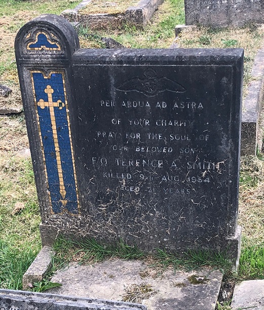 Terence Smith was born on 22nd June 1933. He received a commission on 27th February 1952 to the rank of Acting P/O on probation and placed on the active list for four years and four years in the reserve, this period of service was to count from 26th September 1951. He was graded as P/O on 28th November 1952 and rose to F/O on 26th December 1953. I credit Mina Schmidt / Findagrave.com for the photograph of his gravestone.