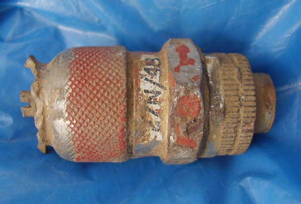I visited the field where the aircraft first made impact in July 2008 with air historians Ken Reast, Albert Pritchard and Eric Barton after gaining permission from the landowner. Photographs obtained from the crash investigation report held in the National Archives made it possible to pinpoint the exact point of impact (shown in the photograph above) and although few fragments were found in this area there is no doubt that this was location. Upon striking the ground, which is very hard in this field, the aircraft bounced back into the air for a few feet prior to exploding in the air. A scatter of wreckage was located below where this must have occurred and two pieces of interest are shown below. After the explosion the momentum of the aircraft carried the wreckage over a farm road and across a number of fields with engine parts travelling over 1,000 yds. The area where this occurred had standing barley in it in July 2008 so a search of these fields was not possible. After harvest we returned and searched the second field and numerous fragments were located across the whole field.