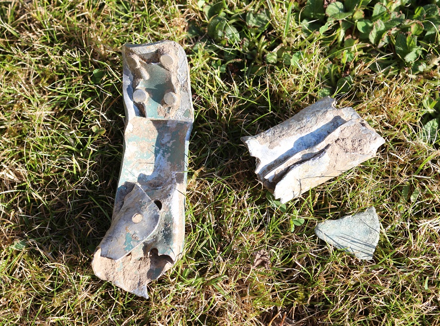 Historians Eric Barton, Albert Pritchard and Ken Reast sought permission to visit the site and intelligence from the landowner to pinpoint it in August 2009. They found a few small fragments of the aeroplane to confirm the location. The photograph above shows several fragments Eric located.