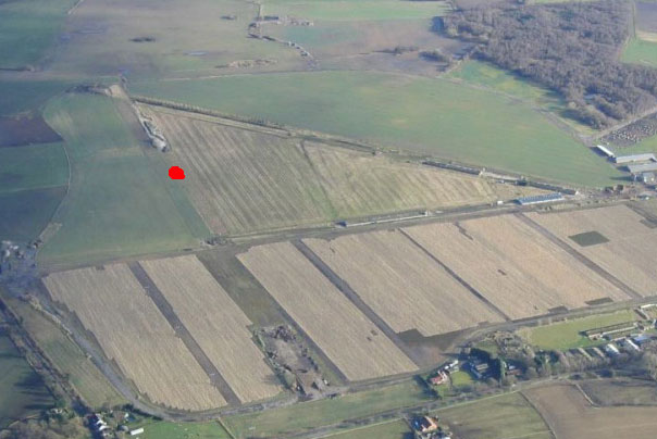 A photograph of the airfield in 2005 with the crash site marked (photograph Mr Graham Sharpe).