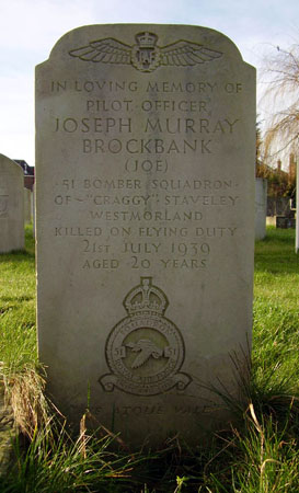 Joseph Brockbank received a commission to the rank of Acting P/O on probation on 19th February 1938 and was later graded as P/O on 29th November 1938. He is buried in Leconfield churchyard and is commemorated by a memorial within Staveley Church, Westmorland. He was attached to 166 Squadron from 51 Squadron at the time of his death.