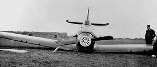 This may be the incident that F/O John Terence Webster RAF (37436) was involved, which was a belly landing at Catterick, but the aeroplane's identity is not known. The photographs shown below apparently show one aeroplane from two angles and is believed to have been the one damaged by Webster at Catterick. If these photographs are of a different mishap at Catterick, or relate to two different but similar incidents I would love to learn of any correction I need to make.