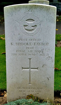 Keith Brooke-Taylor received a commission to the rank of Acting P/O on probation on an unknown date but probably in mid-1938. He was graded as P/O on 29th August 1939. He was killed on 7th April 1940 serving with 83 Squadron when Hampden L4054 crashed near St.Mary's Lighthouse, Whitley Bay. Fellow ACIA air historian Russell Gray located the crash site with assistance from Ken Reast, Albert Pritchard and Eric Barton in 2007, with Russ and family members of one other member of the crew of L4054 erected a memorial on the lighthouse. Keith Brooke-Taylor was twenty one years old and is buried at Chevington Cemetery, Northumberland. His brother Sgt Rex Brooke-Taylor was killed on 30th December 1940 in New Zealand flying in Oxford R6226.