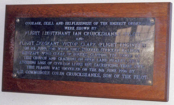Fifty one years after this crash members of the Yorkshire Air Museum were responsible for erecting a memorial at the foot of the church tower in Clifton. Members of the airmen's families were in attendance, they included A/C Colin Cruickshanks AFC (the pilot's son), the pilot's mother and two sisters of the flight engineer.