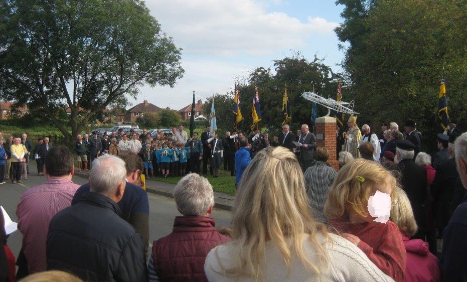 The post office house appears to have stood on what is now the carpark to Springbank Surgery. The aircraft then broke up down the street from that point heading east and ended in a field at Ralph Garth. A memorial was dedicated in the village on the seventieth anniversary of the accident. I thank Norman Waller, Chairman of the Parish Council, for supplying the photograph of the memorial dedication shown here. Prior to this memorial being created a small typed rememberence card was held in the village church with additional information and photographs.