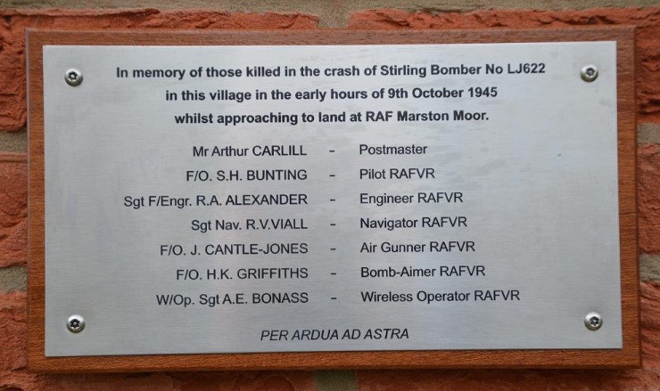 On the night of 8th / 9th October 1945 this No.1665 Heavy Transport Conversion Unit aircraft was flown on a cross country training flight. The crew took off from Marston Moor at 18.10hrs. With the exercise all but complete the crew returned to the general area of Marston Moor airfield where they were based and at 01.18hrs contacted flying control for permission to enter the airfield's circuit. Visibility appears to have been poor at the time the aircraft was in the air. The crew were given permission to enter the airfield's circuit, which allowed crews to orbit the airfield at a given height but to then await further permission to then go ahead and make an approach to land, they were not given permission to land. Four minutes later the aircraft crashed down the main street in the closest village to the airfield, Tockwith and unfortunately then broke up over a quarter of a mile stretch of the street (known as Marston Road) travelling west to east. The Stirling's crew of six were killed. It appears to have first struck the village post office with its port wing tip then, as it broke up, struck various other properties with fires that then broke out causing further damage. Nineteen houses were quoted in newspapers as being damaged by either wreckage hitting them or fire. Remarkably only one civilian was killed as a result of this incident, he was the village postmaster who was sleeping in the attic bedroom of the post office, his family were also in the property but were sleeping in rooms lower down the house and survived. The end of the wreckage trail was in a field to the east of the village and near where a memorial was erected in 2015. It was thought probable that while flying at 2,000 feet and in making a turn in poor visibility, the pilot had allowed the aircraft to stall and then lost control resulting in the crash. The street along which the aircraft crashed is on exactly the same heading as the west to east runway on the nearby airfield. It has also been suggested that the crew mistook lighting along the street for the airfield's lighting and therefore attempted to land on the street. The RAF investigation made no mention of this on the accident reports so I feel this has to be discounted.