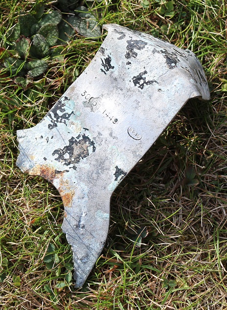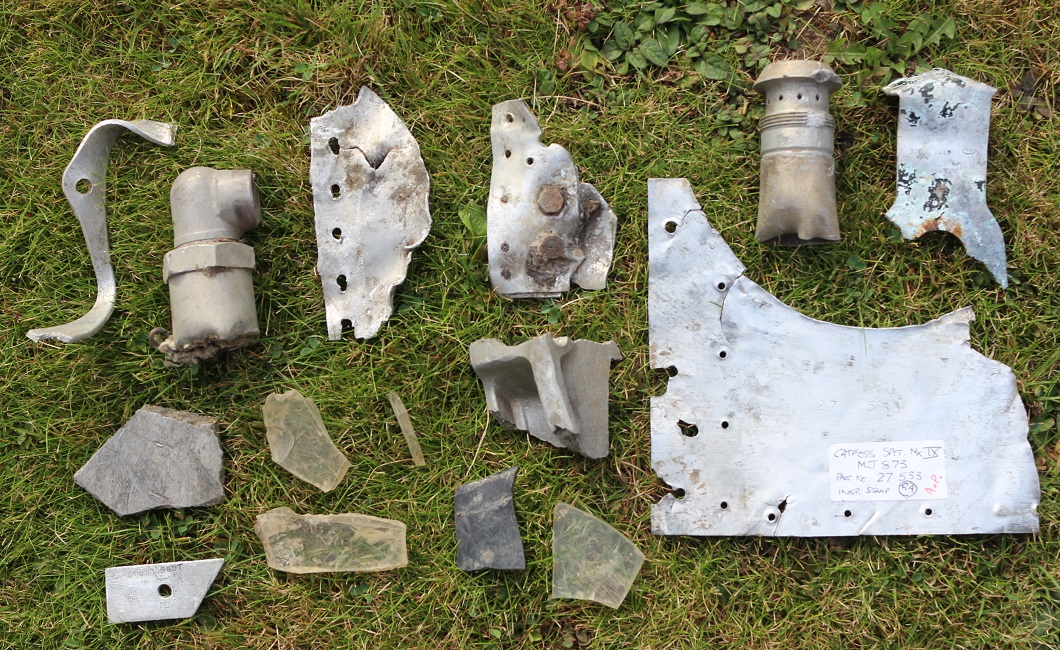 An MoD licence to excavate the crash site was granted in 2007 for Spitfire MJ411 and was excavations took place a number of times by local buisnessman Rodney Robinson in the year that followed. These digs saw both the Merlin engine and also a complete 20mm cannon recovered as well as parts of the airframe. Present at the dig that saw a cannon recovered was air historians Eric Barton and Albert Pritchard. Eric took the two photographs shown above (I can't say I agree with a small child being near the cannon with a potential live 20mm round in the breach but everyone survived so it was ok). Eric retained a few smaller parts found for his collection. These items are shown in the photographs below. Since their deaths I have been given the research of both Eric and Albert, both were under the impression that the dig they attended was to observe MJ873 being recovered and not MJ411 hence the reference to the former made by Eric on his label.