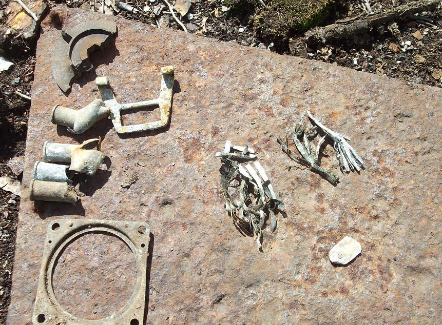 A collection of a few interesting items found on the peat surface. The foil in the photograph below appears to be "window". It was carrying guns because .303 cases are at the site, which is interesting to know post-war Lancasters at training units were still flying armed. The buckle is from a parachute.