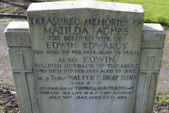 Wireless Operator - Sgt Walter Hall Bradshaw RAFVR (2209908), aged 20. Buried Salford (Weaste) Cemetery, Lancashire.